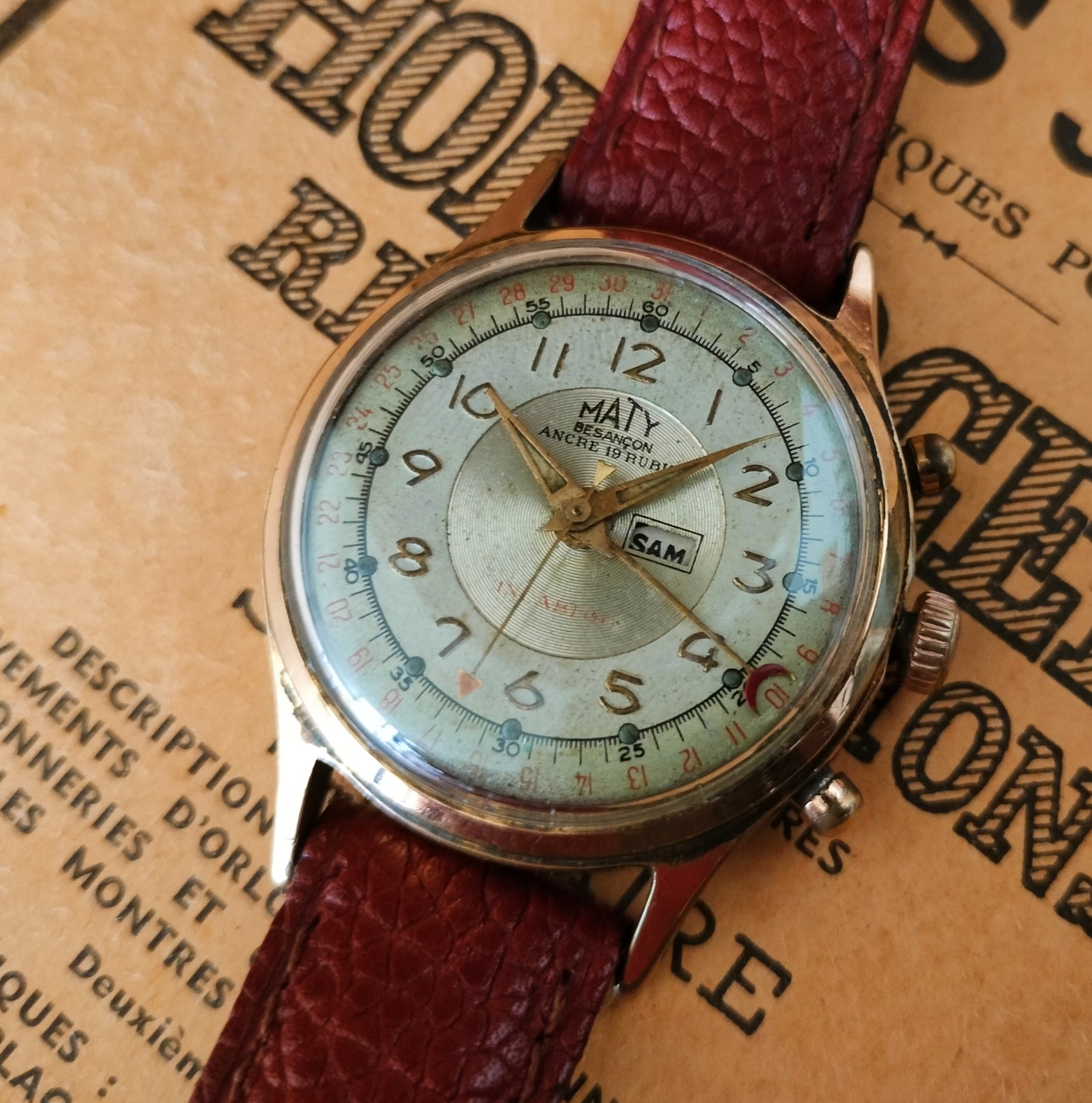 Modèle : Double date Marque : Maty Année : 1950 Calibre : Boitier : Plaqué or Observation(s) : Etat : En fonctionnement Statut : Collection