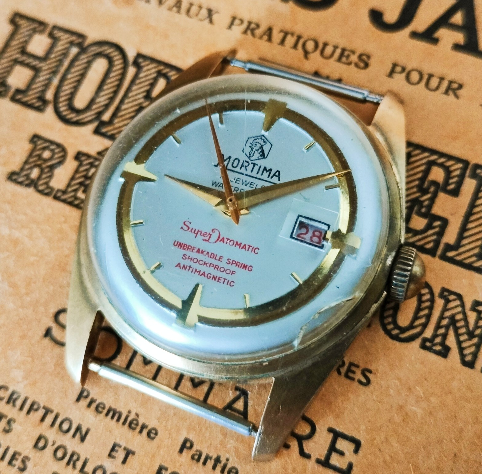 Modèle : Super Datomatic Marque : Mortima Année : 1960 Calibre : Cattin C.66 Boitier : Plaqué or Observation(s) : Etat : A réviser Statut : Vendue