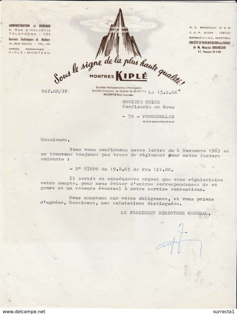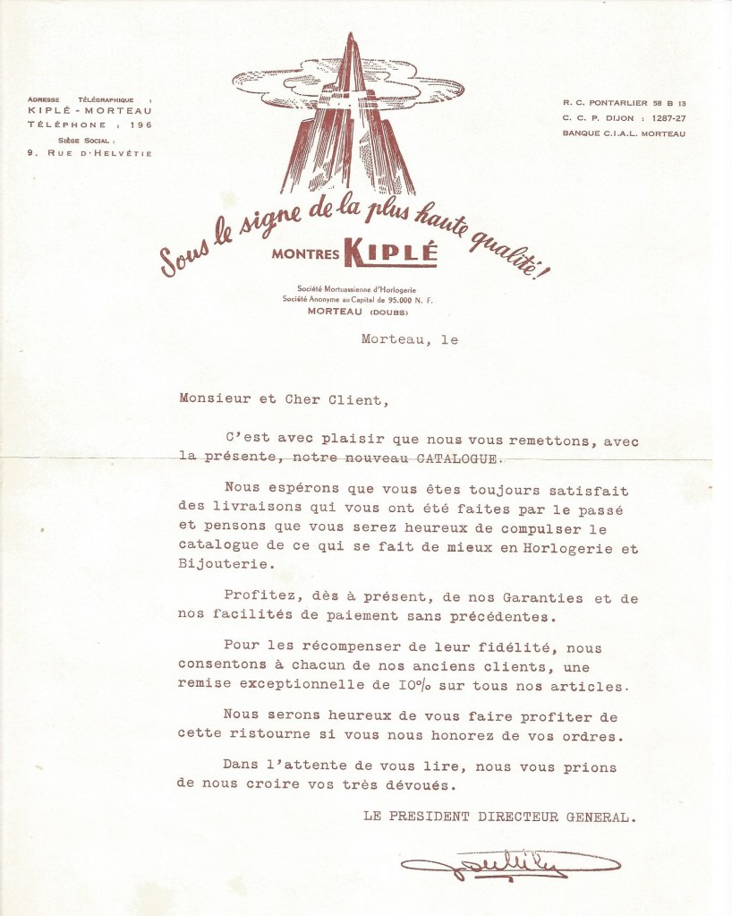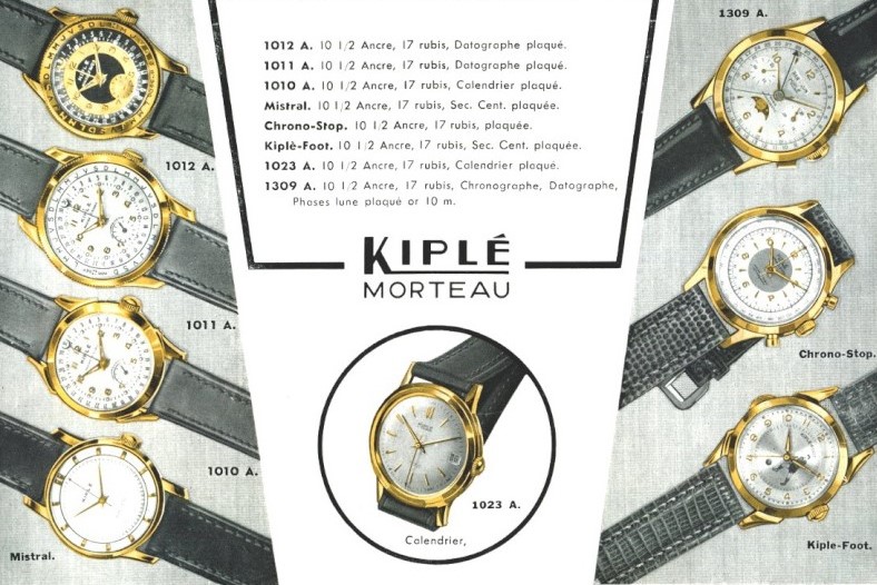 La marque « Kiplé » naît en 1953, fondée par Jacques Bouhelier (1929) à Morteau dans le Jura. Ce-dernier collabore à l’activité de son père Maurice (1904-1982), ouvrier horloger installé à son compte depuis 1949 au 33 rue Neuve, où il fabrique des montres sous la marque Bouée avec des ébauches françaises. Son fils créera la marque « Kiplé, la montre qui plaît » en 1953 pour vendre les montres qui changent alors de nom. Les premières montres de la marque, dont celle présentée ici, ont ainsi été fabriquées dans l’atelier de Maurice Bouhelier. Outre la correspondance des ébauches de l’Horlogerie de Savoie (LORSA) avec l’activité de Maurice, le premier catalogue date de 1955.