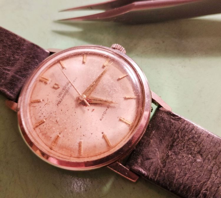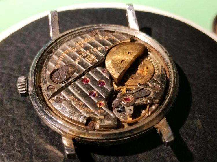 A l’arrivée de ce calibre 218-9 de chez Universal Genève j’ai d’abord été très agréablement surpris par l’état du cadran. La montre a souffert des effets de l’eau et est très aux prises avec la rouille.
